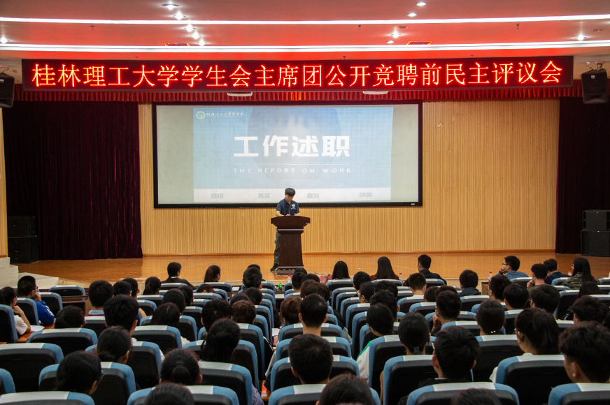 2018年10月10日,校学生会在雁山校区图书馆报告厅开展2018年校学生会主席团成员公开竞聘前民主评议会。校团委副书记莫媛老师、校团委刘茜雯老师,校学生会全体成员参加了本次大会。