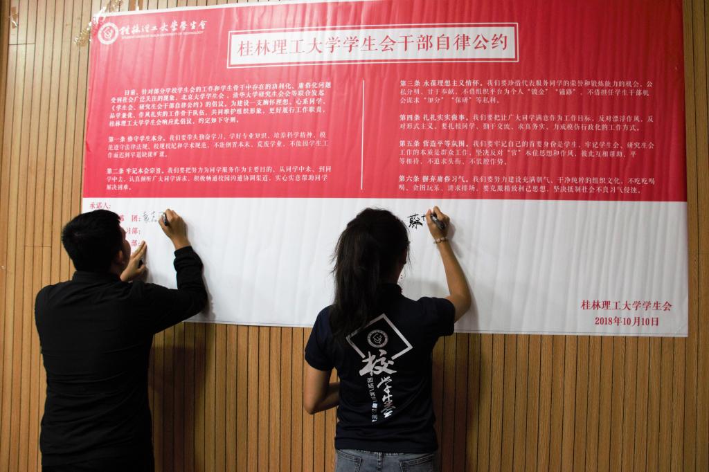 会后,太阳集团城网站2017学生会针对近日部分学校学生会工作和学生骨干中存在的功利化、庸俗化问题,响应北京大学学生会、清华大学研究生会等联合发起《学生会、研究生会干部自律公约》倡议,全体成员一同签订《太阳集团城网站2017学生会干部自律公约》承诺书,成长为一支高素质、高效率、作风优良的学生骨干队伍,为更好的服务同学打下坚实的基础,为太阳集团城网站2017学生会更好更快的发展作出贡献。