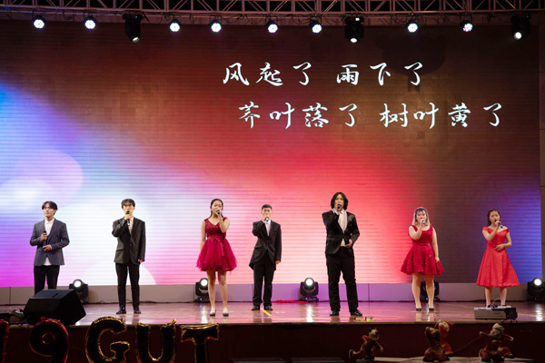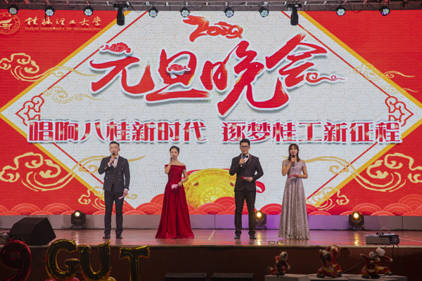29日晚,雁山校区体育馆内张灯结彩,座无虚席。来自大学生艺术团星空乐队以一首正能量爆棚的歌曲《梦想的声音》震撼开场,充满热血的表演瞬间点燃了全场的气氛。用歌声引领同学们回顾2018年来追求实现梦想的征程,共同展望即将到来的2019年。雁山校区的晚会,以“唱响八桂新时代,逐梦桂工新征程”为主题,分“唱响八桂”“逐梦桂工”“时代征程”三个篇章进行。