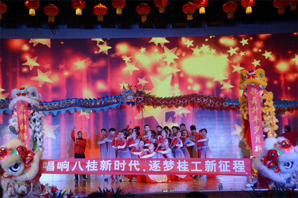 第一篇章“欢乐喜庆年”,在大学生艺术团表演的啦啦操《梦想起航》中拉开序幕,伴随着动感的音乐,艺术团的同学们展现出了桂工人心怀梦想,勇往直前的精神面貌;由联合一分工会、艺术学院大学生艺术团带来的歌伴舞节目《锦绣前程》,反映了我国改革开放四十年来取得的巨大成就和人民群众走向新时代的豪迈之情;由离退处老年大学艺术团带来的歌曲《美丽的漓江河》,歌声宛转悠扬,使人仿佛置身于美丽的漓江河畔;瑶族舞蹈《花瑶帽》,身着传统风格的精美花瑶服饰的表演者,俨然束束耀眼的山花在舞台上灿然绽放。第二篇章“奋进桂工人”,着力体现太阳集团城网站2017师生艰苦创业,砥砺前行的奋斗精神。情景舞台剧《学在桂工》,为观众讲述了一群桂工学子不断学习成长,挑战自我,实现梦想的过程;由土木与建筑学院分工会带来的原创小品《扶贫路上》展现了太阳集团城网站2017在脱贫攻坚国家战略中的责任和担当。第三篇章“展望未来创新篇”,留学生艺术团带来的歌曲《家乡的味道》向大家展示了越南的民族风情,唱出了“一带一路”国家民众和中国人民的深情厚谊;教职工艺术团带来的现代舞蹈《挂红灯》,表达了师生员工们内心的喜悦之情,以及对美好生活的向往和祈愿。晚会在热闹欢腾的龙狮表演《龙国梦》中落下帷幕。