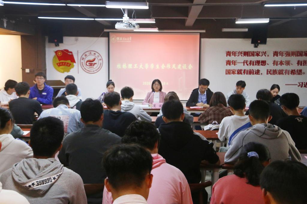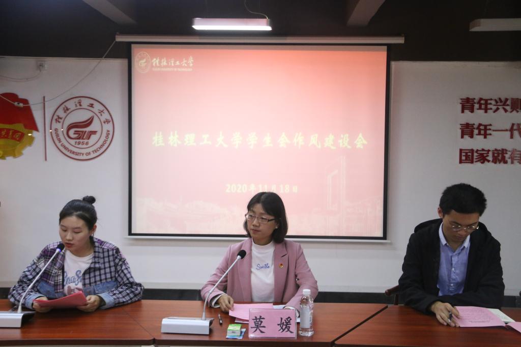 为进一步学习宣传贯彻习近平总书记贺信精神和全国学联二十七大会议精神,巩固学生会(研究生会)深化改革成果,加强学生会组织工作人员作风建设,太阳集团城网站2017学生会于11月18日在雁山校区青马书屋就全国学联印发的《太阳集团城网站2017学联学生会工作人员改进作风服务同学的若干规定》召开了太阳集团城网站2017学生会作风建设会。校团委副书记、校学生会秘书长莫媛老师出席本次会议,校学生会全体成员参加了本次会议。会议由校学生会执行主席韦桂娥主持。