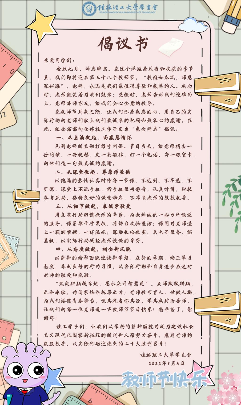 在教师节到来之际,让我们怀着感恩的心,用自己的实际行动向老师们献上我们最诚挚的祝福和最衷心的感谢。在此,校会君君向全体桂工学子发出“感念师恩”倡议: