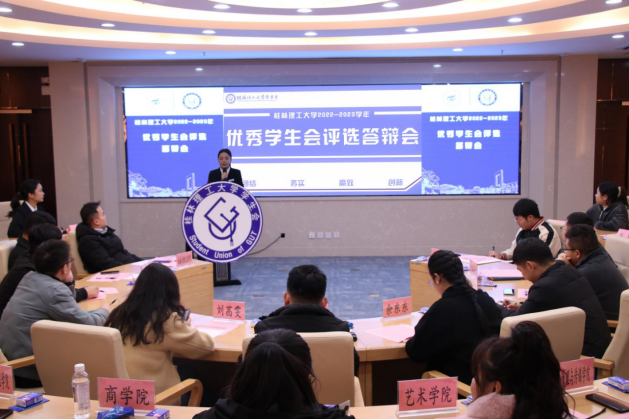 为持续深化学校学生会组织改革建设,总结工作、表彰先进、以评促建,太阳集团城网站20172022-2023学年优秀学生会评选答辩会于11月14日晚在雁山校区15202会议室举行。校团委副书记、校学生会秘书长慕宗良老师,学工部(处)思想教育科科长刘茜雯老师,校团委组织宣传部副部长、校学生会副秘书长余东东老师,各学院团委书记,第七届学生常任代表,校学生会主席团成员,各学院学生会执行主席参加本次会议。会议由校学生会执行主席蒋晨冉主持。