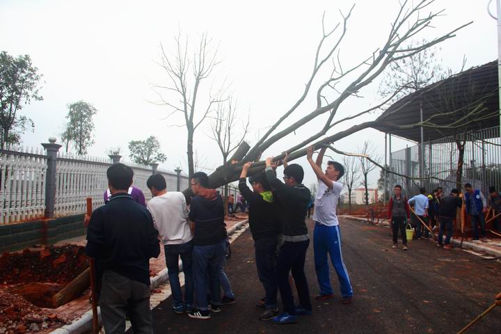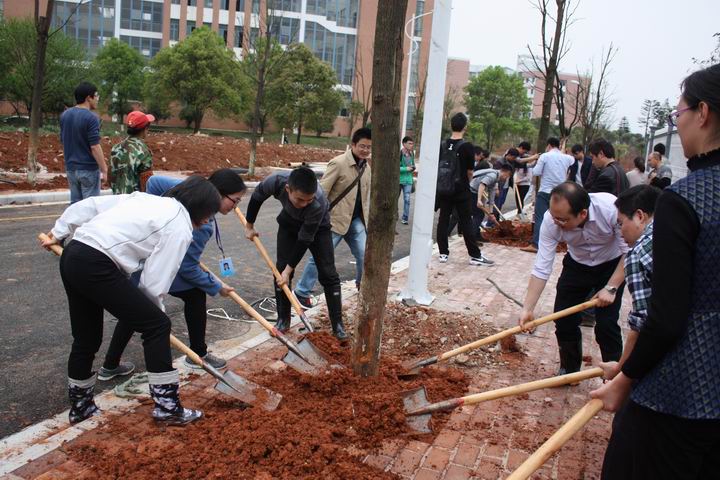 师生们以饱满的热情投入到植树活动中,现场一片热火朝天的劳动景象,七八人一组,铲土填坑、挥锹培土、扶树浇水,每个细节都认真完成。在老师同学们的同心协力下,不一会儿,一排校道大树便培植起来。