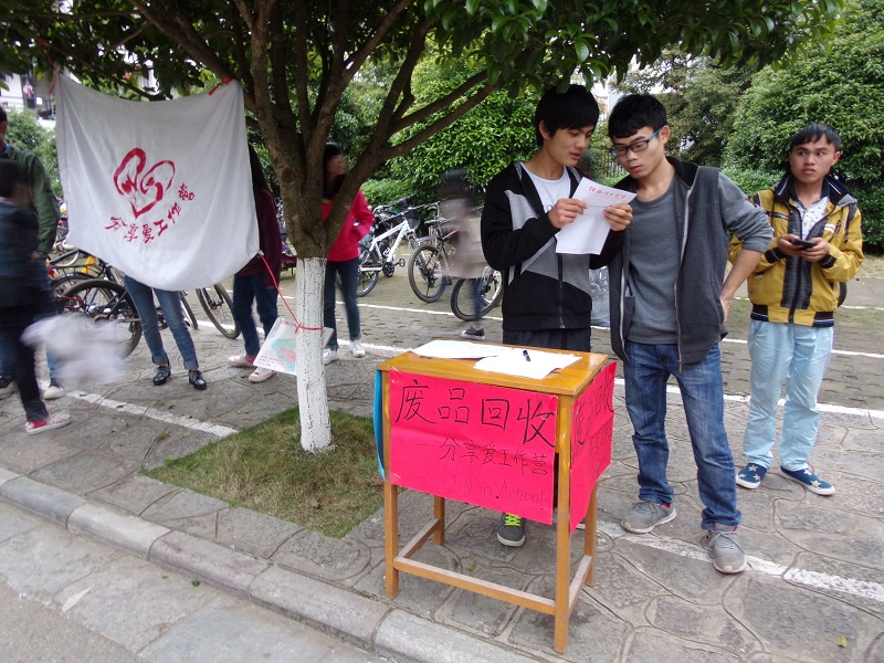 27日下午17:30,分享爱工作营的志愿者们就开始在设点处布置,一号为10A对面,二号为24栋对面,并向来往的同学们介绍此次的活动及目的。不少同学留下了宿舍号,甚至直接引领分享爱工作营的志愿者去宿舍,将平时收集的废品回收,同时表示今后愿意继续收集废品,为麻风病康复者贡献出自己的一份力。