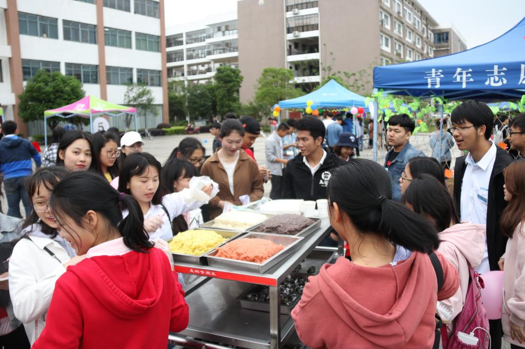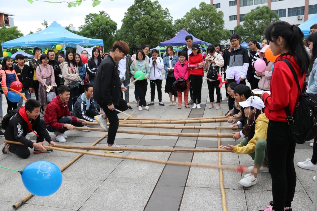 伴随着优美旋律的民族音乐响起,民族服饰体验、品茶、慢骑自行车、剪纸体验等趣味活动相继开展,同学们纷纷排着长队,跃跃欲试,体验不同民族间的传统文化。竹竿舞、踩高跷等都是少数民族的特色运动,同学们都积极参与其中感受传统文化的魅力,即便天空不作美,下着雨,刮着风,也浇不灭、吹不走同学们的热情。吸引他们的不仅仅是游戏,还有美食飘出的香味。参与活动不仅可以体验到快乐,还可以领取游戏券去兑换美味的“三月三”传统美食五色糯米饭和青团。趣味运动和美食的结合,将民族传统文化风情飘满整个校园。