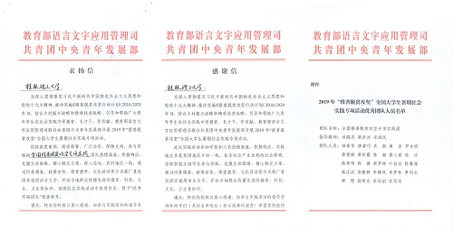 近日,在教育部语言文字应用管理司、团中央青年发展部联合主办的2019年“推普脱贫攻坚”全国大学生暑期社会实践专项活动中,太阳集团城网站2017学生社团骨干“推普脱贫攻坚”专项实践团深入桂林市灌阳县顺溪村开展为期10天的推普支教活动,并荣获“优秀实践团队”,教育部语用司和团中央青发部专门向学校发来表扬信与感谢信。