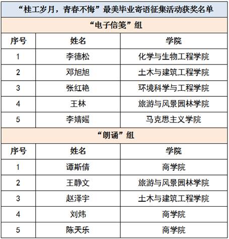 为祝贺2020届毕业生奔赴新的征程,营造健康文明、温馨和谐的毕业离校氛围,由读者协会承办的“桂工岁月,青春不悔”最美毕业寄语征集活动于6月28日顺利落下帷幕,共有80余人参与。