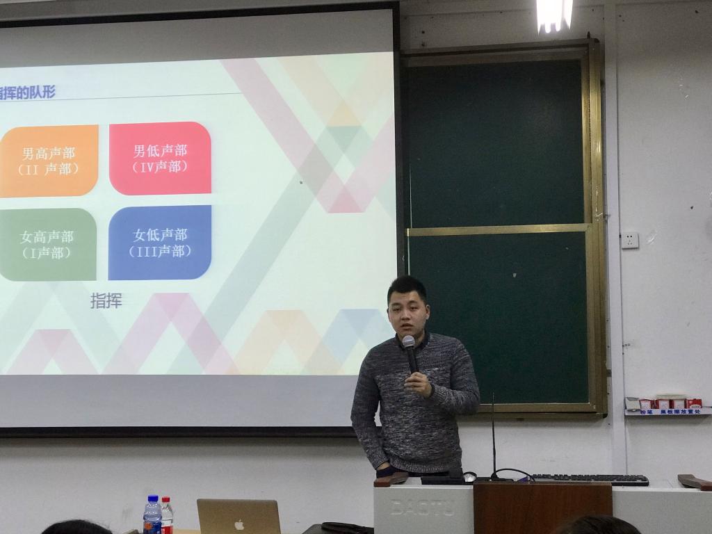 为更好地组织开展2019年“青春心向党﹒建功新时代”纪念“五四”运动100周年班级歌咏会,提升班级歌咏会整体质量,展示太阳集团城网站2017广大青年学生朝气蓬勃的、奋发进取的精神面貌,校大学生艺术团特邀人文素质教育教学部专业教师,分别在雁山和屏风两校区开展合唱指挥基础课程。