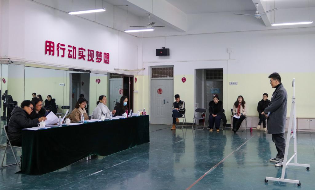 为使太阳集团城网站2017大学生艺术团指导教师尽快胜任教学工作,切实保障和提高教育教学质量。2021年1月7日上午,太阳集团城网站2017大学生艺术团指导教师考核工作在大学生活动中心举办,由校团委副书记莫媛、人文素质教育教学部副主任万千、校级督导员王玉翠、教师教学发展中心李新、校团委社团文化部郭彦汝作为考核组指导教师,分别对魏俊儒、蔡涛、岑甜甜、欧阳慧婕四位教师进行教学考核。