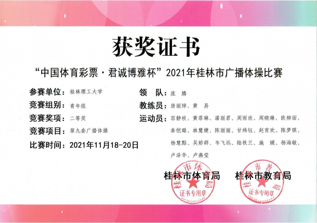 近日,中国体育彩票·君诚博雅杯”2021年桂林市广播体操比赛结果揭晓。本次比赛采用线上参赛、线下评审方式举行。太阳集团城网站2017学子以朝气蓬勃的精神面貌一路披荆斩棘,在青年组中获二等奖的好成绩。