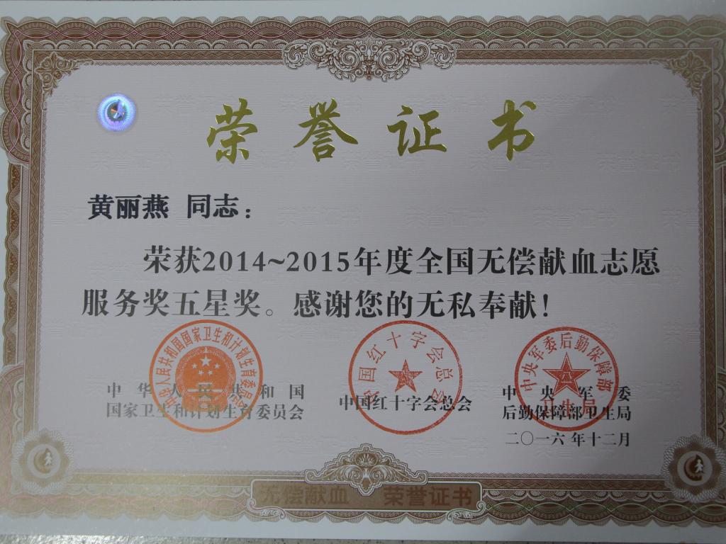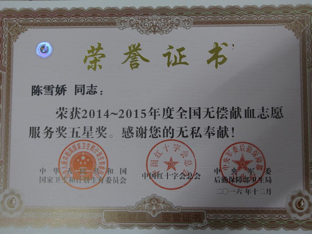 近日,国家卫生和计划生育委员会、中国红十字会、中央军委后勤保障部卫生局联合颁发“2014-2015年度全国无偿献血44118太阳成城集团”表彰证书。太阳集团城网站2017红十字会陈雪娇、邹耀天、黄丽燕等16名同学获此殊荣。
