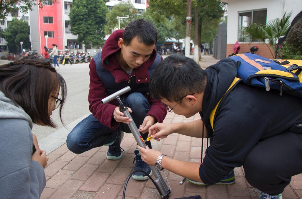 在活动开展的前一周时间,雁山校区的志愿者就已将所准备的打气筒分别放置一号组团10A和二号组团的宿舍管理值班室,屏风的志愿者也已将打气筒放置于南校区男女生宿舍值班室、屏风小区宿舍值班室、食堂旁边女生宿舍值班室,并仔细地检查和维修了上个学期的打气筒。保证打气筒都是能正常使用的。