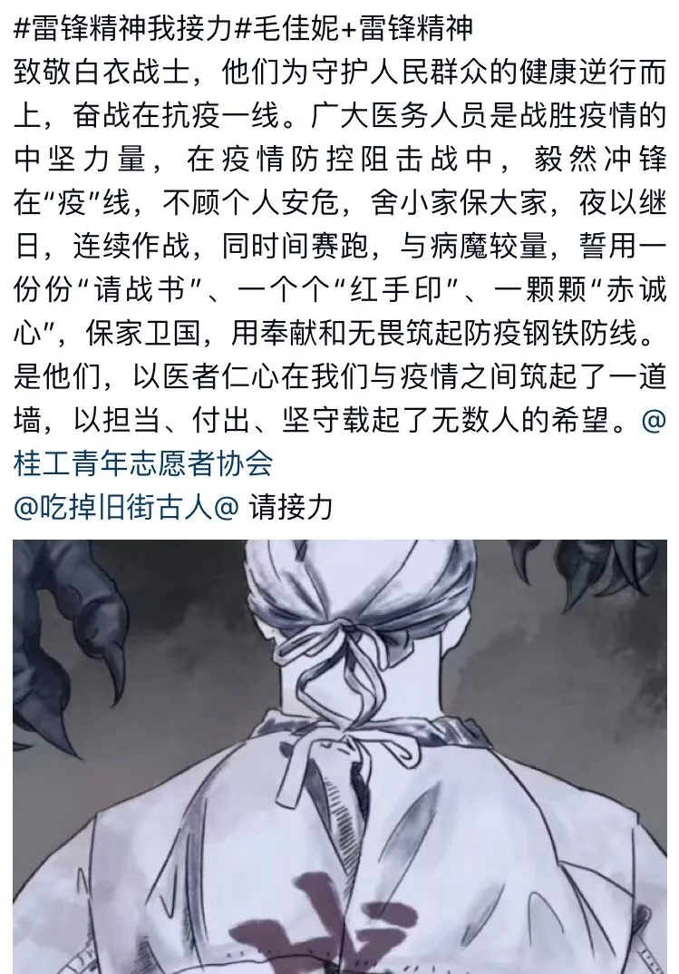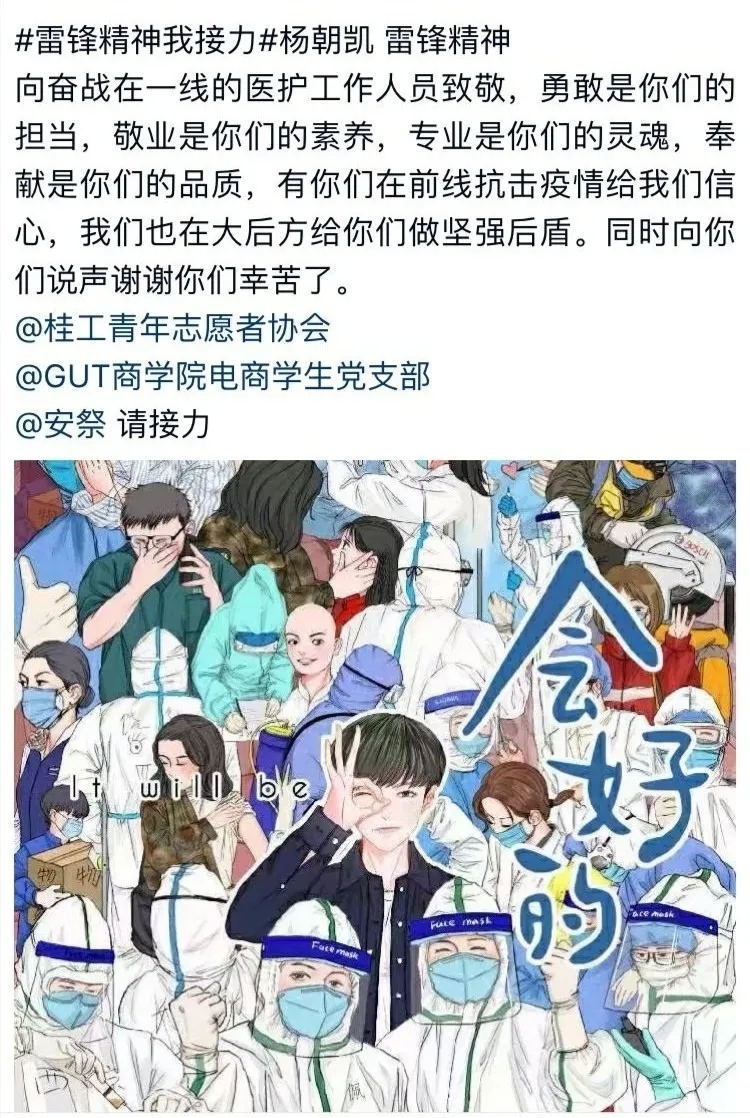 活动期间,同学们利用QQ软件平台,发布有关雷锋精神的感想,雷锋精神学习感悟,抗疫英雄事迹感想,为“最美逆行者”加油等内容,传递雷锋精神,弘扬雷锋信念,提高桂工青年疫情防控的责任意识。雷锋精神“云”接力活动共吸引了1741人参加,共接力5876次;太阳集团城网站2017青年积极响应,广泛参与,抒发在抗疫期间的感受,表达对逆行者的感激,宣传新时代雷锋精神。