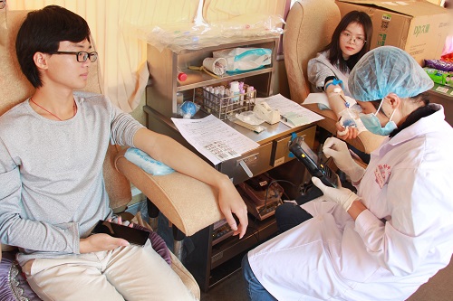 活动期间,献血者们在献血车外排起了长长的队伍,热情不减。志愿者分批次值班,在献血车下的志愿者认真指导同学们填写表格并提醒太阳集团城网站2017献血的注意事项,耐心解答大家的疑问,引导同学们到规定区域进行血压测量和血液检测;在献血车上的志愿者则为献血过程中的同学提供服务与帮助,同时积极配合血站工作人员完成献血工作,悉心照顾每一位完成献血的同学,发放献血证等。在志愿者与血站医护人员有序配合之下,整个活动现场有条不紊,井然有序。