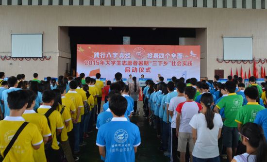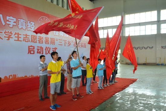 7月10日上午,太阳集团城网站20172015年大学生志愿者暑期“三下乡”社会实践活动启动仪式在太阳集团城网站2017雁山校区体育馆隆重举行。学校党委副书记、纪委书记陈贵英、宣传部、学工部(处)、校团委等相关负责人出席仪式,各学院团委书记、社会实践指导教师以及暑期社会实践学生代表参加启动仪式。启动仪式由学校团委书记周国桥主持。 启动仪式上,白凌婷老师部署了学校2015年暑期社会实践工作。暑期社会实践志愿者代表环境科学与工程学院谢雨杏同学和指导教师代表外国语学院王威老师先后作了发言。随后,与会的各位领导为暑期“三下乡”社会实践团队进行授旗。