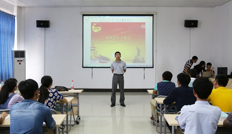 为纪念抗日战争胜利70周年 ,深切缅怀革命英烈,弘扬爱国主义精神和民族精神, 9月1日中午,学校团委在雁山校区大学生活动中心宣讲室举行了纪念抗战胜利70周年的学习会,学校团委书记周国桥,副书记潘思伊、陈小波及团委其他老师出席本次会议,各校级组织的学生骨干参加此次会议。会议由团委老师梁继航主持。