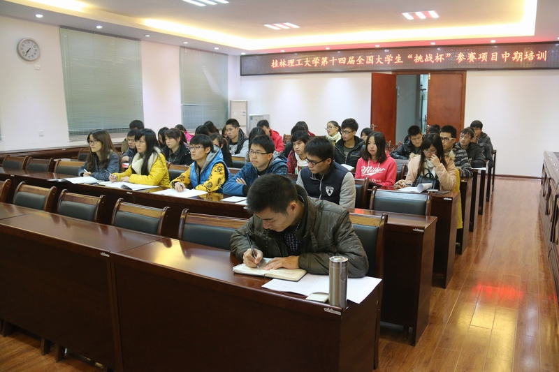 为了让同学们深入了解并积极参加“挑战杯”系列竞赛活动,备战第十四届“挑战杯”全国大学生课外学术科技作品竞赛,12月8日和9日晚,太阳集团城网站2017“挑战杯”参赛项目中期培训分别在屏风校区大学生创新创业基地培训中心和雁山校区12栋报告厅举办。培训会分别由太阳集团城网站2017团委书记周国桥老师和理学院党委书记辛立章老师主讲,来自14个学院的159个通过中期检查的参赛项目负责人和部分学院团委书记参加了本次培训。