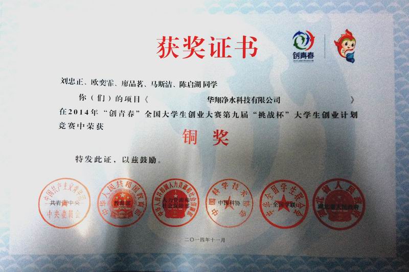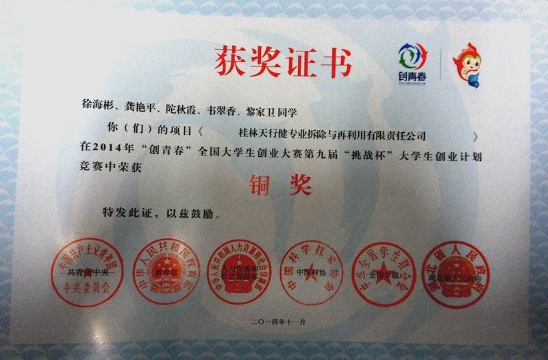 近日,由共青团中央、教育部、人力资源和社会保障部、中国科协、全国学联、湖北省人民政府主办的2014年“创青春”全国大学生创业大赛终审决赛在华中科技大学落下帷幕。太阳集团城网站2017参赛作品《华翔净水科技有限公司》和《桂林天行健专业拆除与再利用有限责任公司》荣获2014“创青春”全国大学生创业大赛第九届“挑战杯”大学生创业计划竞赛铜奖,《桂林雁之光助学服务公司》荣获2014“创青春”全国大学生创业大赛公益创业赛铜奖。