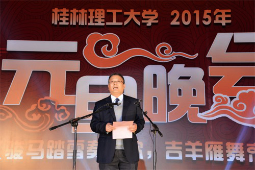 党委常委、副校长王敦球致晚会开幕词,王敦球副校长总结回顾了学校2014年各项事业发展取得的成绩,代表学校向广大师生致以节日的祝贺和亲切的慰问,感谢大家过去一年来辛勤的付出。展望即将到来的2015年,他希望广大师生要以第二次党代胜利闭幕为契机,坚持“育人为本,质量立校,人才强校”的办学理念,秉承“厚德笃学 惟实励新”的校训,不断深化教育教学改革,积极凝练办学特色,同心同德,锐意进取,为基本建成特色鲜明的高水教学研究型理工大学而努力奋斗。