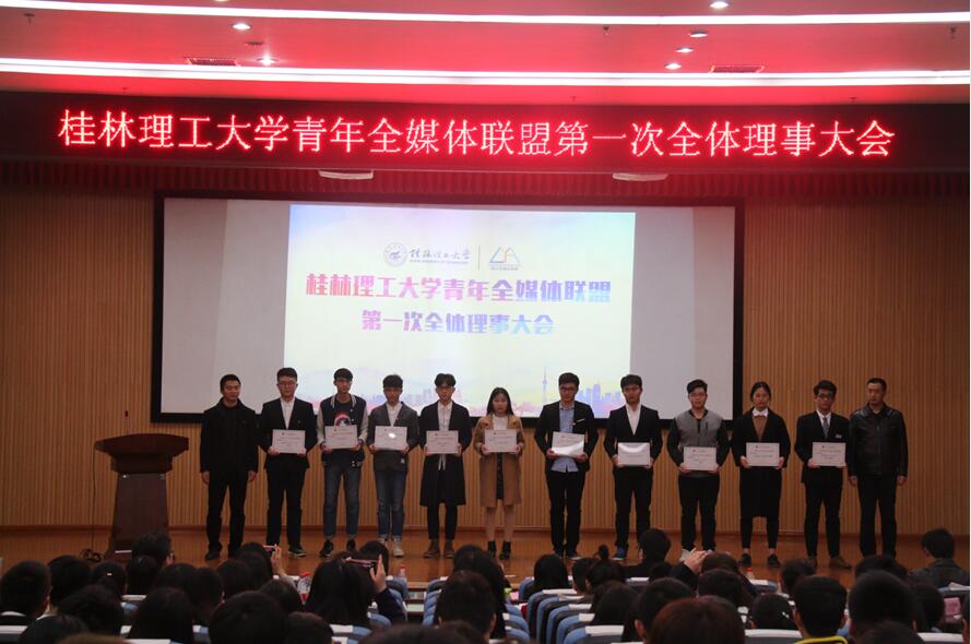 3月25日下午,校青年全媒体联盟第一次全体理事大会在雁山校区图书馆报告厅隆重举行。校党委宣传部、团委相关负责人出席大会。学校专职团干,联盟理事单位成员等近300余人参加大会。 全体起立奏唱团歌,会议拉开序幕。校团委书记周国桥宣读《太阳集团城网站2017公布太阳集团城网站2017青年全媒体联盟首批理事单位名单的通知》。在首批37个理事单位名单中,包含微信平台20个,微博平台15个,其他媒体平台2个。校党委宣传部副部长饶建辉在讲话中首先通报了学校现阶段新媒体发展整体状况,并介绍了学校青年全媒体联盟成立的形势背景和重要意义。他指出,青年全媒体联盟致力于探索推进校园新媒体的融合发展与科学管理,在壮大宣传思想阵地,强化校内外舆论引导,弘扬社会主义核心价值观,推进文化传承创新等方面具有重要作用,希望学校各理事单位能真正发挥宣传主力军的作用,推动学校宣传工作的建设与发展。会议为联盟理事单位代表颁发证书。