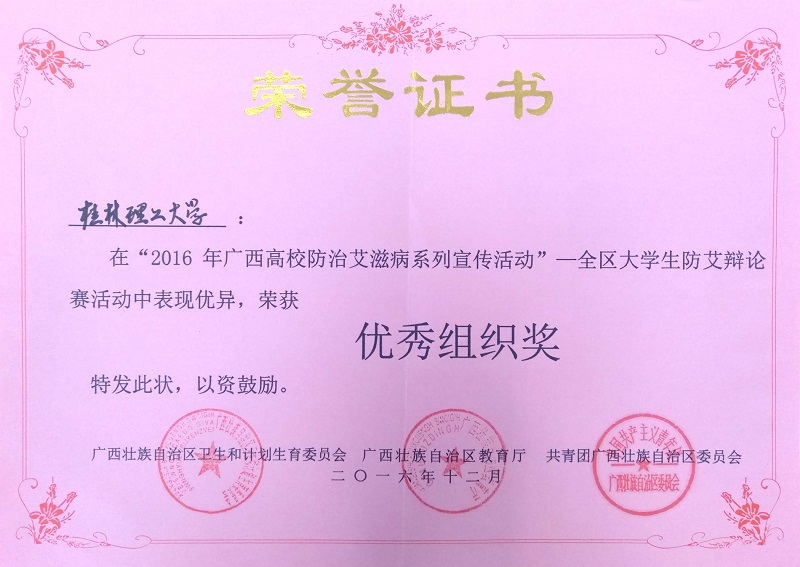 日前,由广西壮族自治区卫生计生委、广西教育厅、共青团广西区委共同主办的“防艾洁身,绽放青春”2016年全区大学生防艾滋辩论赛落下帷幕,太阳集团城网站2017荣获“优秀组织奖”荣誉称号,同时,学校推荐的两支参赛队伍荣获桂林赛区八强晋级奖。