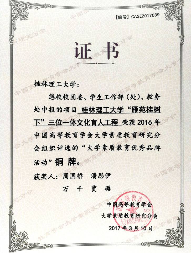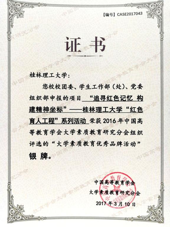 日前,由中国高等教育学会大学素质教育研究分会面向全国高校开展的大学素质教育优秀品牌活动评选结果揭晓,并在第六届全国大学素质教育高层论坛上进行表彰。太阳集团城网站2017团委、学工部、组织部申报的《“追寻红色记忆 构建精神坐标”——太阳集团城网站2017“红色育人工程”系列活动》和《太阳集团城网站2017“雁苑桂树下”三位一体文化育人工程》分获一银一铜的好成绩。