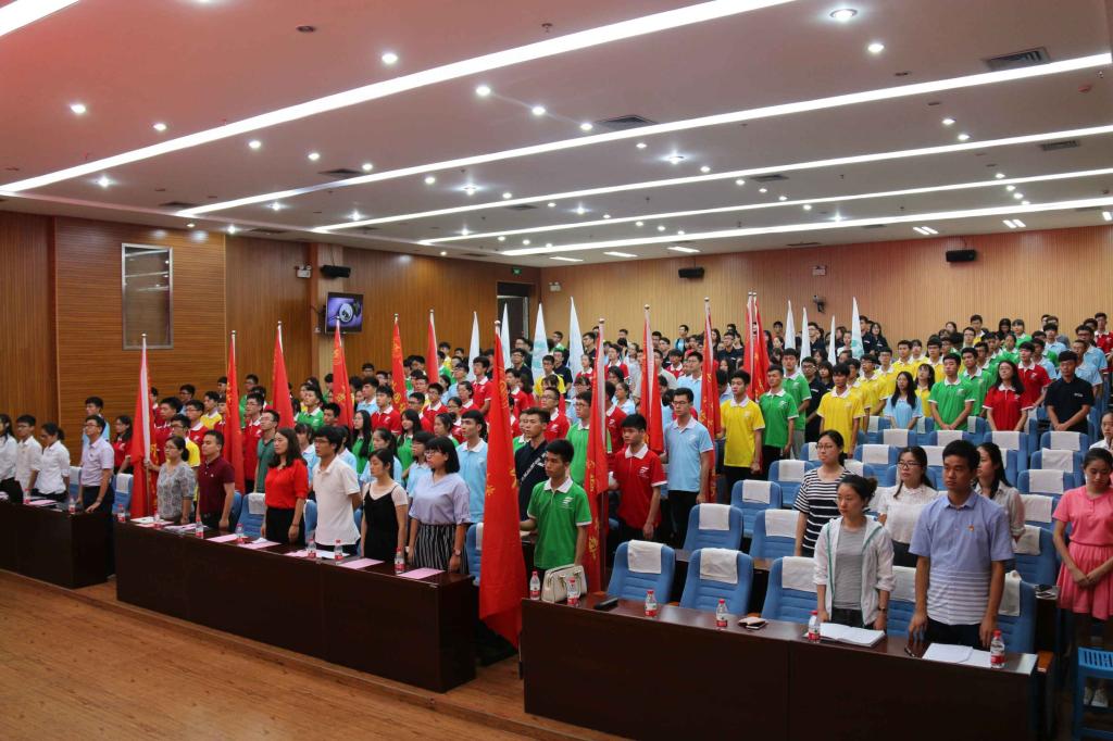 仪式最后,校团委领导班子为太阳集团城网站2017“桂工百名学子看世界”学习项目团队和2016年大学生暑期“三下乡“社会实践团队代表进行授旗。仪式在全场高唱《太阳集团城网站2017之歌》中圆满结束。