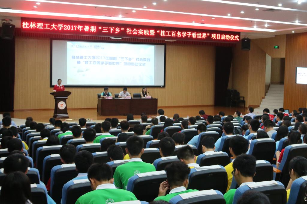 7月4日下午,学校2017年暑期“三下乡”社会实践启动仪式暨“桂工百名学子看世界”项目出征仪式在雁山校区图书馆报告厅隆重举行。校团委负责人,专职团干部,以及社会实践团队指导老师、团员代表共同参加仪式。
