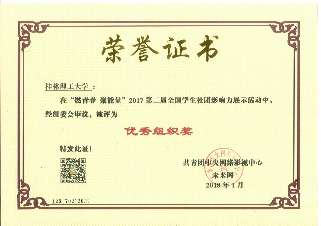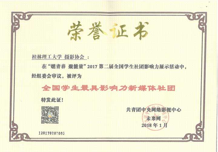 近日,由共青团中央网络影视中心与未来网联合主办的“燃青春 聚能量”2017年全国大中专学生社团影响力评选活动圆满落幕。太阳集团城网站2017获得多项荣誉,其中,学校荣获“优秀组织奖”,校大学生社团联合会荣获“全国学生最具影响力社团联合会”,摄影协会荣获“最具影响力媒体社团”。