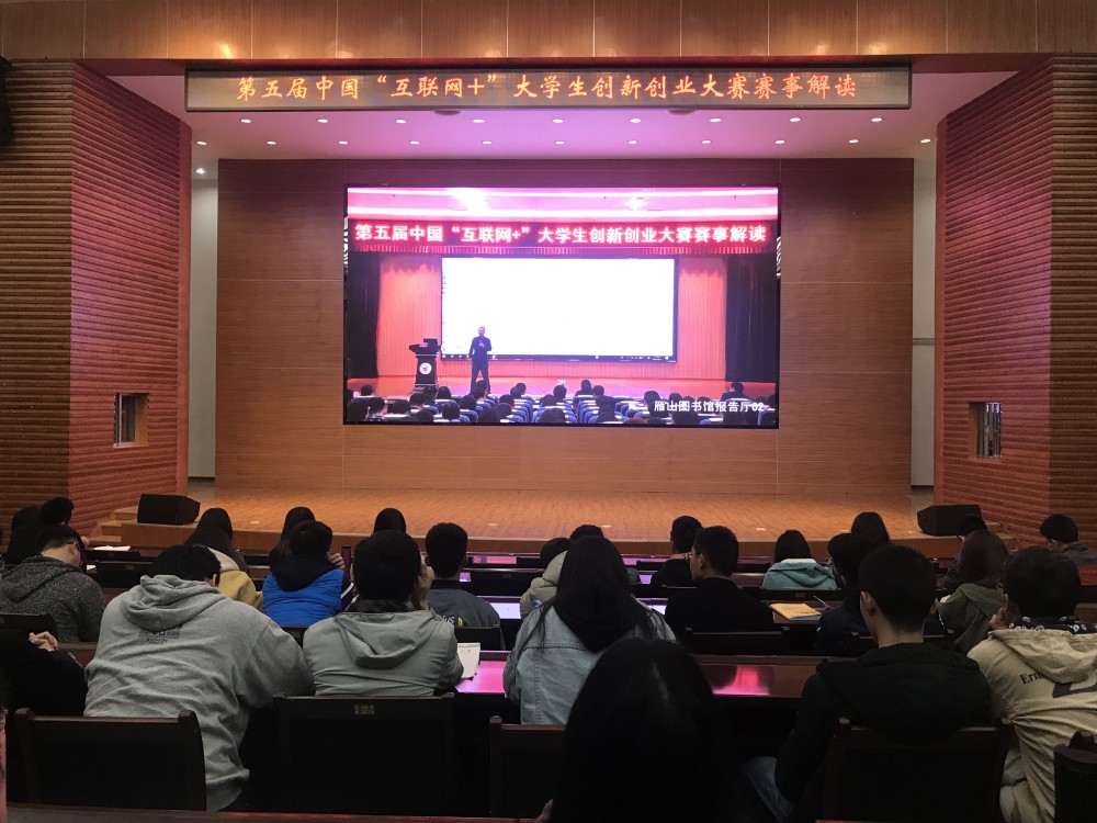 4月1日下午,太阳集团城网站2017第五届中国“互联网+”大学生创新创业大赛赛事解读报告会在雁山校区图书馆报告厅举行,同时在屏风校区图书馆报告厅设立了直播分会场。北京华富嘉辰投资基金副总裁、万学创世教育科技有限公司CEO兼总裁曾劲先生应邀出席会议并做专题报告。教务处、校团委主要负责人、各学院分管教学副院长、创新创业学院相关老师、指导教师、学院团委书记及重点项目团队成员共计500余人参听了报告。