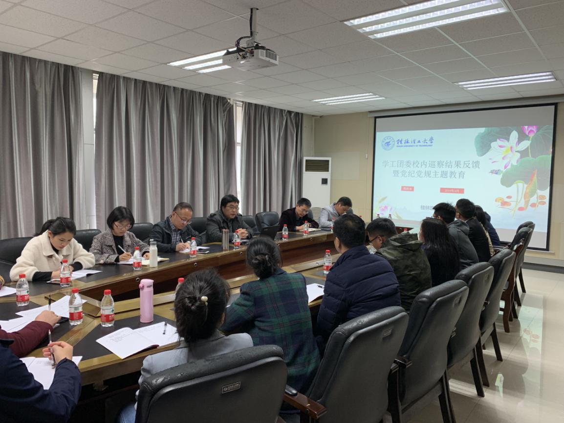 为了认真贯彻学校2019年党风廉政建设工作精神,结合全国样板党支部建设要求。学工团委于4月15日上午在雁山校区行知楼B301会议室召开学工团委校内巡查结果反馈暨党纪党规主题教育学习会议,学校副处级纪检员、监察室副主任周德海出席会议,学工团委支部全体党员参加会议。会议由支部书记张成龙主持。