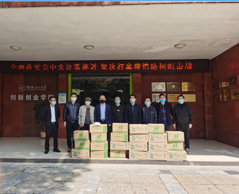 3月10日上午,学校大学生创新创业基地创客会成员企业:桂林正道广告传媒有限责任公司、桂林舟游科技有限公司、桂林大象旅游服务有限公司、桂林市仟融科技有限责任公司、桂林杰定服饰有限公司及桂林戊承文化创意有限公司6家公司向学工、团委捐赠乙醇消毒液4件、84消毒液8件、免洗手消毒凝胶10件,用于支持学校开展防疫工作。学工部(处)部(处)长张成龙、校团委书记李雨代表学工部(处)、校团委接受捐赠。