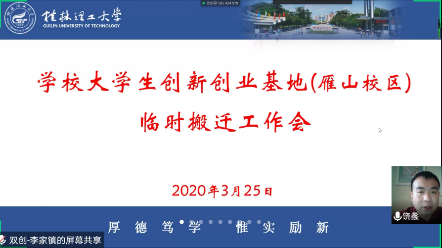 3月25日下午,学校大学生创新创业基地(雁山校区)临时搬迁工作会通过线上形式顺利召开。学校团委饶蠡副书记出席会议并讲话,校团委实践部负责人、大学生创新创业基地管理委员会(以下简称“基地管委会”)相关负责老师及雁山校区大学生创新创业基地各入驻项目负责人参加了会议。