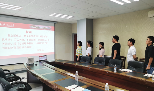 第21届研究生支教团成员从教学工作、扶贫工作、收获体会等方面介绍工作开展情况和成长收获,并鼓励第22届成员们要尽快转变角色,适应工作,做到为人师表,为服务地的教育和人才培养作出更多贡献。随后,第22届研究生支教团成员分别发表出征宣言,纷纷表示到支教岗位后将会服从安排、团结协作,不断加强学习,勇于突破自我,努力圆满完成支教任务。最后,第22届研究生支教团成员集体宣誓,以青春之名,担时代重任。