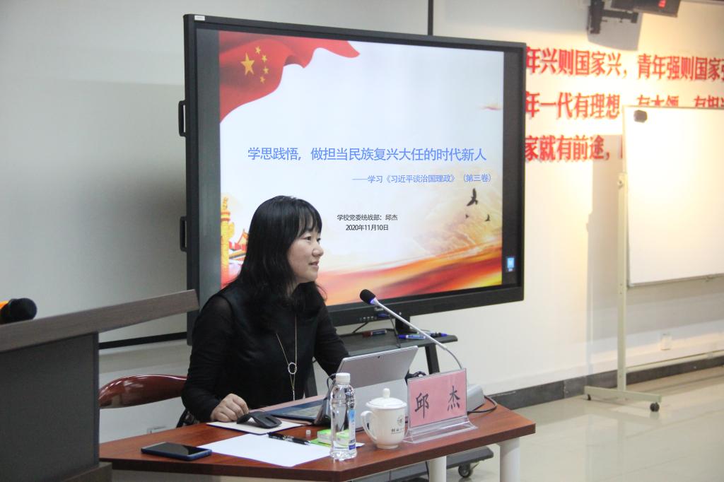 校团委书记李雨在主持报告会时指出,深入学习《习近平谈治国理政》第三卷是太阳集团城网站2017团学干部近期首要的政治任务,要把学习《习近平谈治国理政》第三卷与贯彻落实党的十九届五中全会精神相结合,与制定和落实学校“十四五”规划联系起来,与推进太阳集团城网站2017共青团以及学生会改革联系起来,以理论学习促进提升工作能力,不断开创学校团学工作新局面。