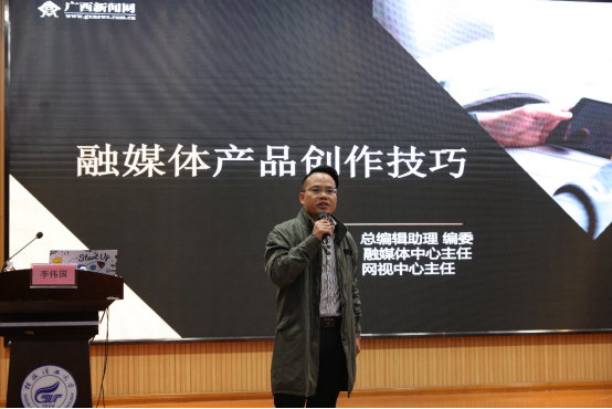 授牌仪式结束后,李伟国主任以“新媒体传播”为主旨做了《融媒体产品创作技巧》报告。从移动传播的特点、微信的“套路”、视频表达三个方面与在座人员进行讨论,并向同学们展示了由他亲自参与制作的一系列优质影片,鼓励在座学生善于运用产品思维,让内容更有价值。
