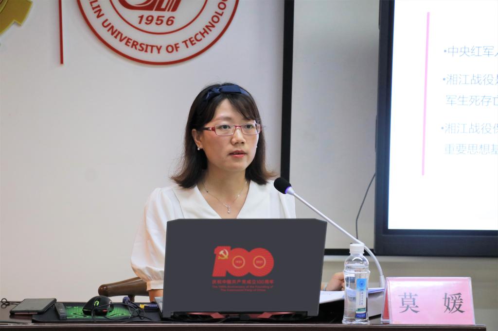 宣讲会上,莫媛老师以《铭记百年光辉历史,传承湘江红色基因》为题,介绍了湘江战役的历史背景,并围绕湘江战役的主要过程、涌现的英雄人物、精神内涵以及当代青年学生如何传承湘江战役精神等方面,带领校学生会全体学生骨干学习了红军战士在湘江战役中的壮烈史实。她号召全体学生骨干积极参与党史学习教育,为普通同学做好榜样,树立标杆;她希望全体学生骨干在党史学习教育领悟中坚定理想信念,在奋发有为中践行初心使命;她要求全体学生骨干要理论联系实际,开展好“我为同学做件事”主题活动,把党史学习教育与为同学们办实事结合起来,进一步提升党史学习教育效果。