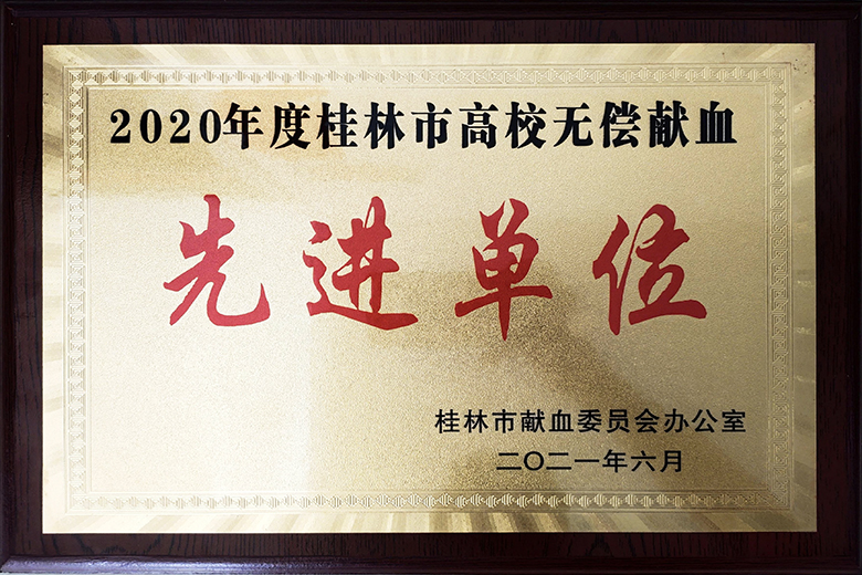 一直以来,学校高度重视校园精神文明建设,培养师生的奉献意识和社会担当,将无偿献血作为全校师生文明素养教育的重要内容之一,学校团委积极推进无偿献血工作,定期在校园内与桂林市中心血站共同组织无偿献血活动,在2021年上半年献血达1397人次,献血量449670ML,名列桂林高校前茅,无偿献血组织工作得到相关单位的肯定和好评。