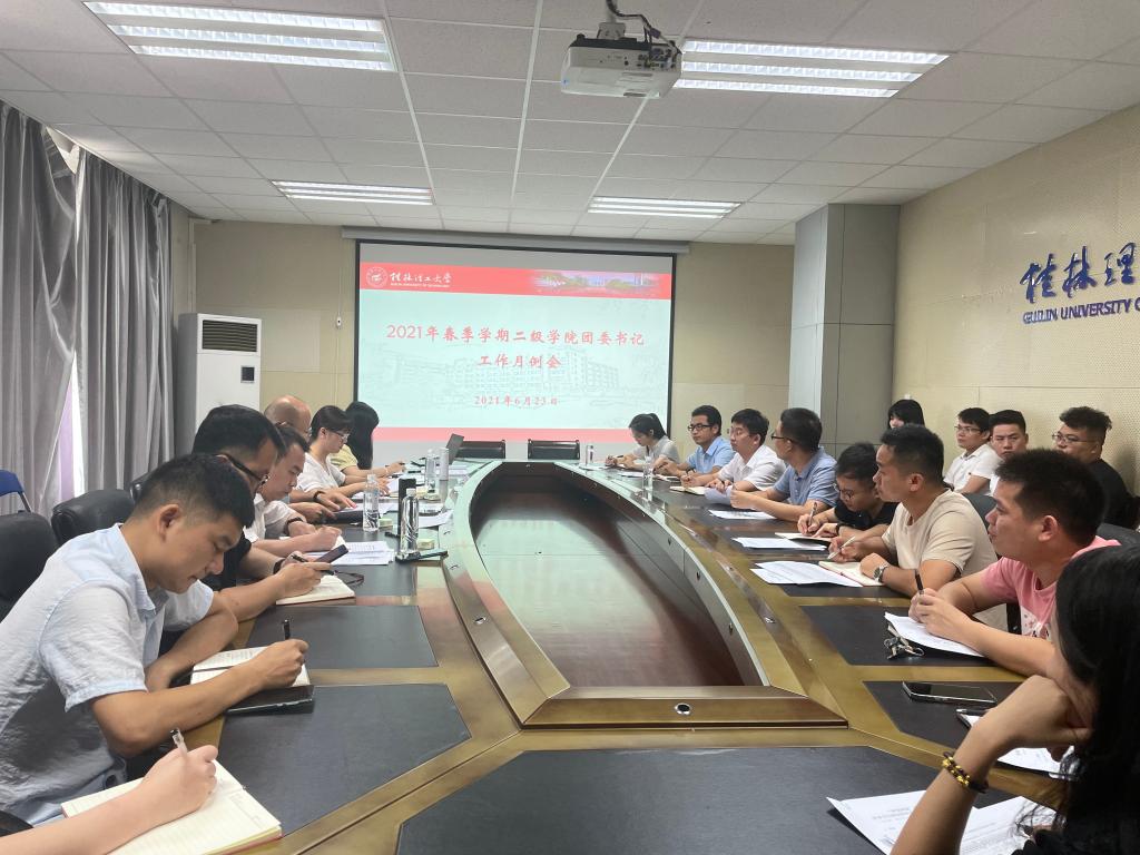 6月23日上午,校团委在雁山校区行知楼B301会议室召开2021年春季学期团委书记6月工作例会。校团委书记李雨、校团委副书记莫媛、校团委副书记饶蠡出席会议,校团委专兼职团干和二级学院团委书记、副书记参加会议。