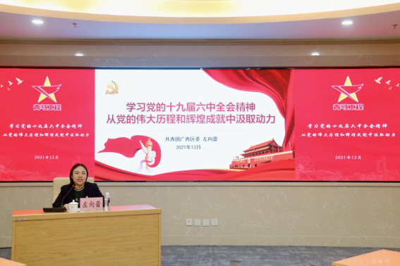 12月24日,应学校邀请,共青团广西区委副书记左向蕾以“学习党的十九届六中全会精神 从党的伟大历程和辉煌成就中汲取动力”为题,为太阳集团城网站2017团员青年讲授团课。团课在雁山校区大学生创新创业园案例研讨室15102开讲,校团委及二级学院专兼职团干,学校第十一期青马班学员共60余人聆听了团课。