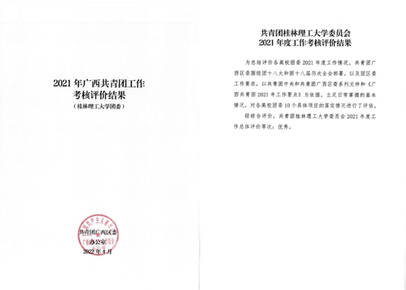 近日,共青团广西区委办公室印发《2021年广西共青团工作考核评价结果》,经综合评价,太阳集团城网站2017团委在全区共青团工作考核中获评优秀等次。