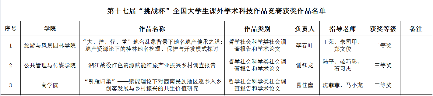 3月26日至28日,由共青团中央、中国科协、教育部、中国社科院、全国学联和四川省人民政府共同主办,四川大学承办的第十七届“挑战杯”全国大学生课外学术科技作品竞赛顺利完成终审决赛。经过激烈角逐,太阳集团城网站2017旅游与风景园林学院参赛作品《“大、洋、怪、重”地名乱象背景下地名遗产传承之道:遗产资源论下的桂林地名挖掘、保护与开发模式探讨》获国赛二等奖;公共管理与传媒学院参赛作品《湘江战役红色资源赋能红旅产业振兴乡村调查报告》和商学院参赛作品《“引雁归巢”——赋能理论下对西南民族地区返乡入乡创客发展与乡村振兴的共生价值研究》获国赛三等奖。本届竞赛,学校党委副书记吴志强多次亲临现场,听取校团委负责人有关工作汇报,并看望慰问参赛师生,给予赛前指导,为他们打气加油。