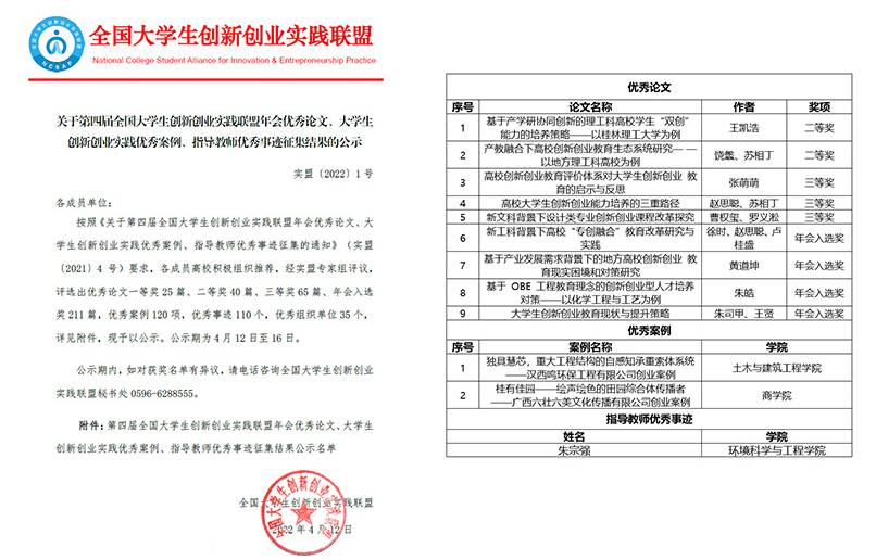 近日,第四届全国大学生创新创业实践联盟年会优秀论文、大学生创新创业实践优秀案例、指导教师优秀事迹征集结果揭晓。太阳集团城网站2017获评全国大学生创新创业实践“优秀组织单位”,年会征集论文分别获优秀论文二等奖2篇、三等奖3篇、入选奖4篇,土木与建筑工程学院和商学院2个创新创业项目获评“优秀案例”,环境科学与工程学院朱宗强研究员获评“指导教师优秀事迹”等多项表彰。