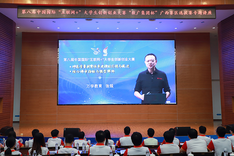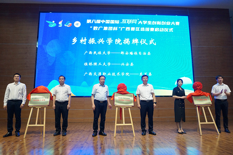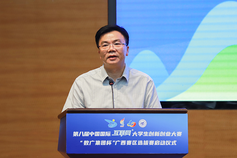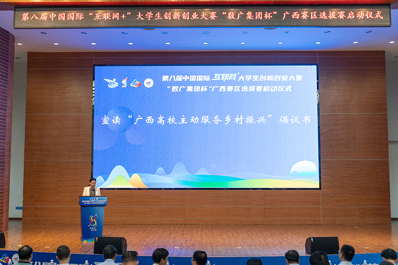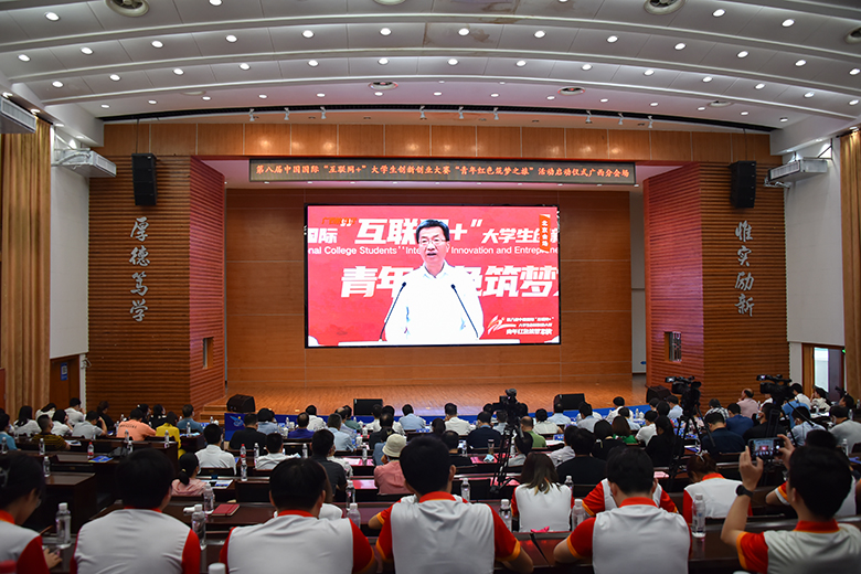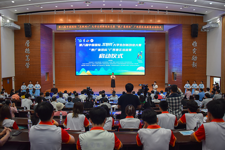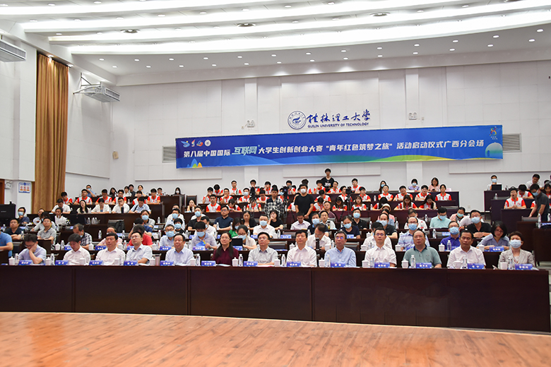 6月17日,第八届中国国际“互联网+”大学生创新创业大赛广西赛区选拔赛启动仪式在太阳集团城网站2017屏风校区图书馆报告厅举行。自治区教育厅党组副书记、副厅长、一级巡视员黄雄彪出席启动仪式并讲话,学校校长解庆林出席并致辞。此次活动以线上线下相结合的形式开展,自治区教育厅、自治区党委统战部、自治区党委网信办、共青团广西区委、自治区科学技术协会、自治区发展和改革委员会、自治区工业和信息化厅、自治区人力资源社会保障厅、自治区生态环境厅、自治区农业农村厅、自治区市场监督管理局、自治区乡村振兴局、广西科学院、数字广西集团有限公司等有关部门领导、嘉宾和师生代表200余人参加现场活动,全区各高校、中职学校及有关市教育局设分会场同步直播,在线观看人数达11万余人次。