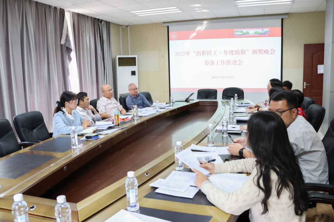 10月18日上午,2022年“出彩桂工·年度致敬”颁奖晚会筹备工作推进会在雁山校区行知楼B301召开。宣传部部长叶昊、校团委书记李雨、人文素质教育教学部主任覃业飞出席会议,宣传部、团委、工会、人文素质教育教学部的相关工作人员参会。