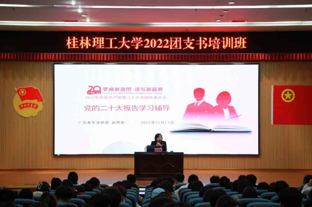 为进一步学习宣传贯彻落实党的二十大精神,11月17日晚,校2022级团支书培训班在雁山校区图书馆报告厅开展学习宣传贯彻党的二十大精神宣讲培训会,广西青年讲师团成员赵思聪老师受邀为培训会作《擎画新蓝图 谱写新篇章》党的二十大报告学习对谈辅导报告。
