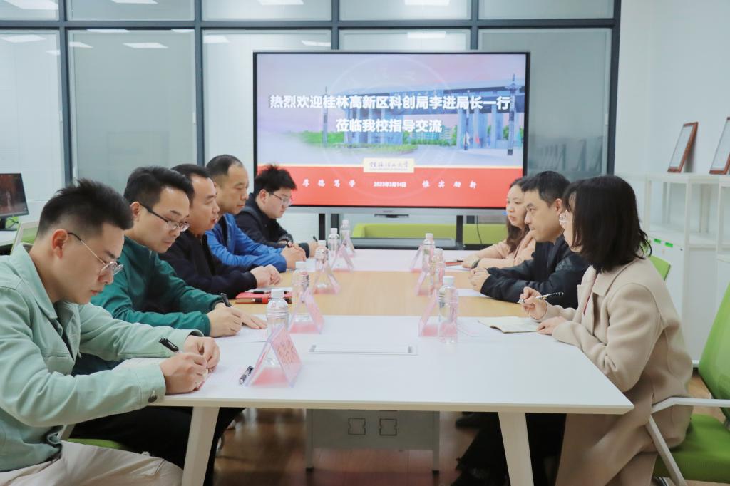 3月14日下午,桂林市高新区科技创新局局长李进一行来访太阳集团城网站2017大学生创新创业园,校团委副书记饶蠡热情接待了来访客人。