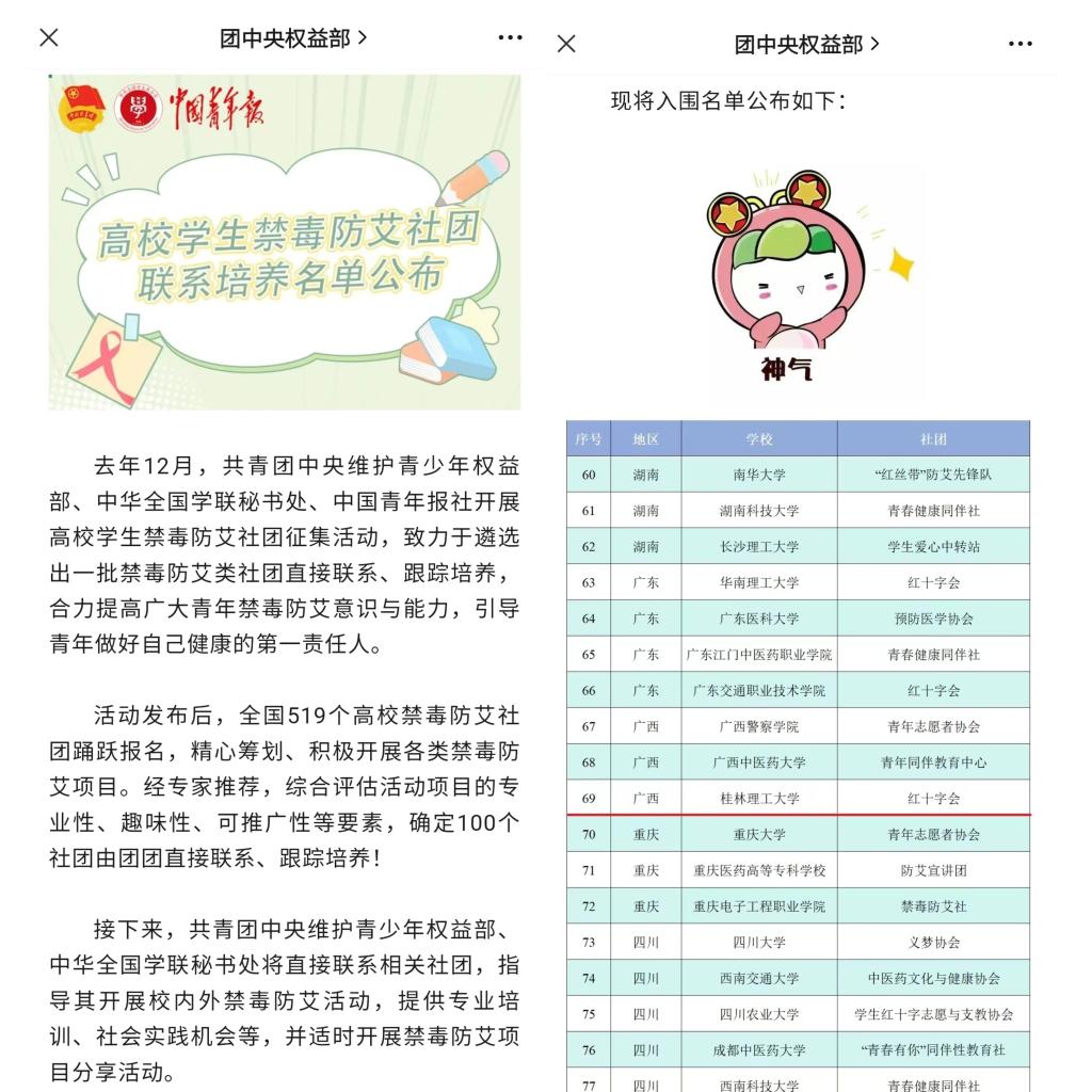 近日,共青团中央维护青少年权益部、中华全国学联秘书处、中国青年报社公布了全国高校学生禁毒防艾社团联系培养名单,太阳集团城网站2017学生社团红十字会成功入选,全区共三所高校学生社团入选。