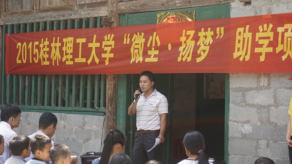村书记潘忠权在启动仪式上发表讲话。他表示,社会实践是同学们增长才干,提升自我的重要平台,希望同学们通过这个平台增强服务意识,促进自身成长成才,并预祝社会实践各项活动取得圆满成功。他对本次下乡的各项活动表示大力支持,并对志愿者历年来对小寨教育事业的关心表示由衷的感谢。紧接着,满田小学潘荣芳老师对此次社会实践团队的到来表示了热烈的欢迎,并对服务队设立“微尘·扬梦”项目表示感谢。之后,项目组向满田小学捐赠了价值2500元的学习用具、图书和运动器材,并向该村顺利考上大学的6名学生给予了一定路费补助。最后,启动仪式在大家一起装饰图书角活动中落下帷幕。